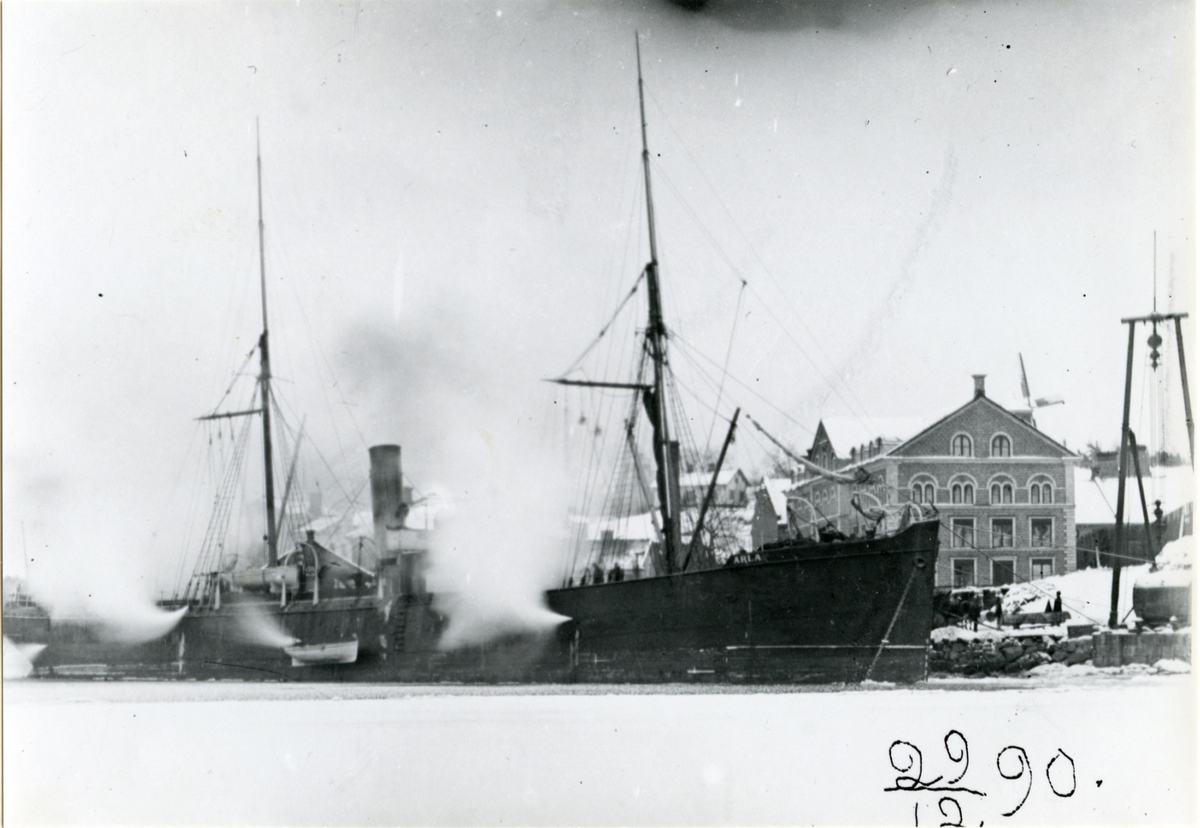 Lastångfartyget ARLA av Stockholm liggande vid Gustafsbergs porslinsfabrik 29 dec. 1890.