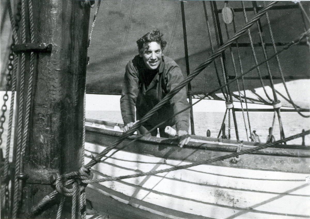Lättmatros Alex Elfving i skeppsbåten på HOPPET av Länna år 1930. Båten var nödvändig, dels som livbåt dels om man ville komma iland från t ex en ankarplats. Vanligtsvis användes ekstocken och skeppsbåten togs på släp och fylldes med färskvatten iland.