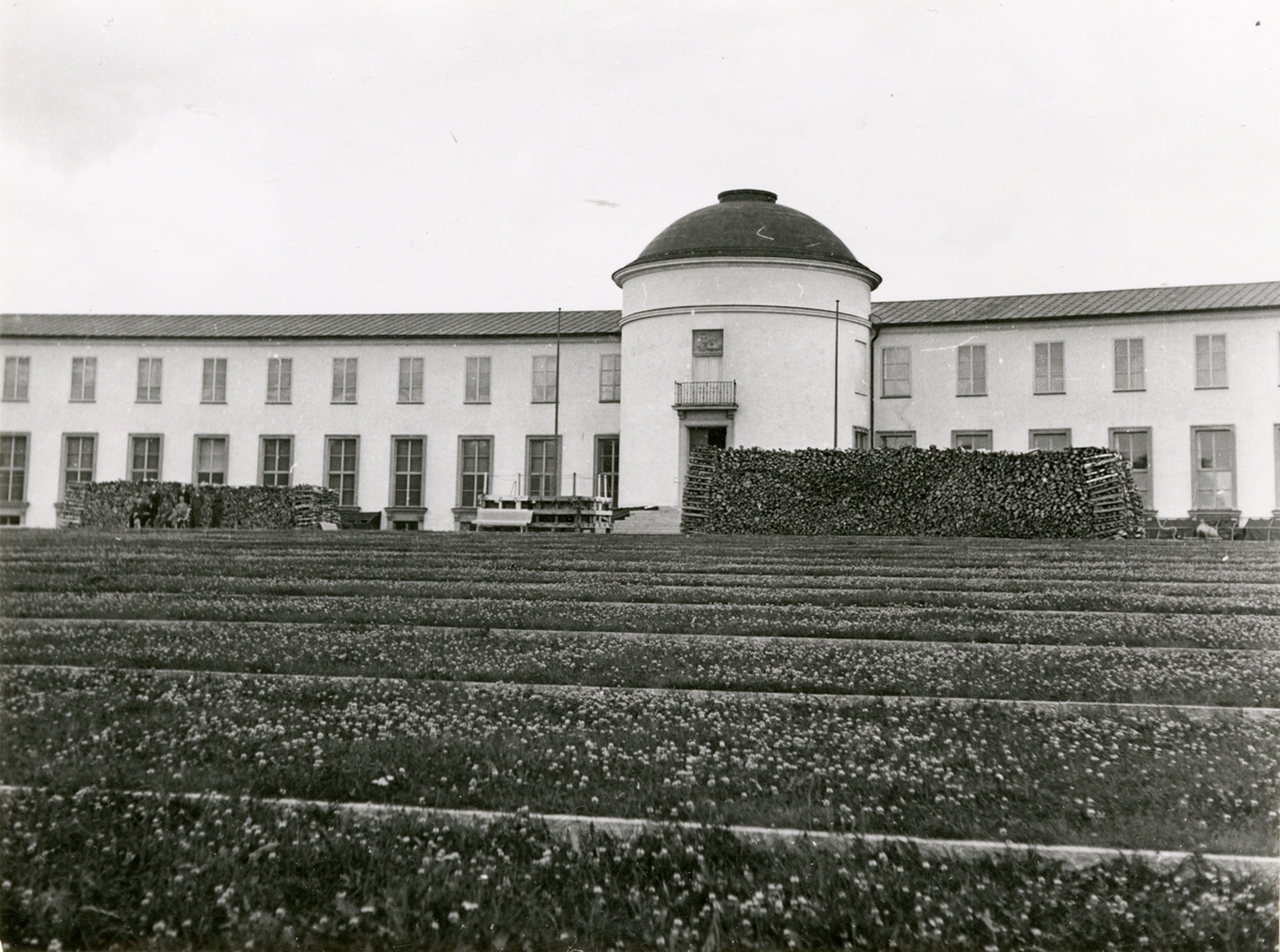 Vedtravar utanför Sjöhistoriska museets byggnad vittnar om bränslesituationen under krigsåren.