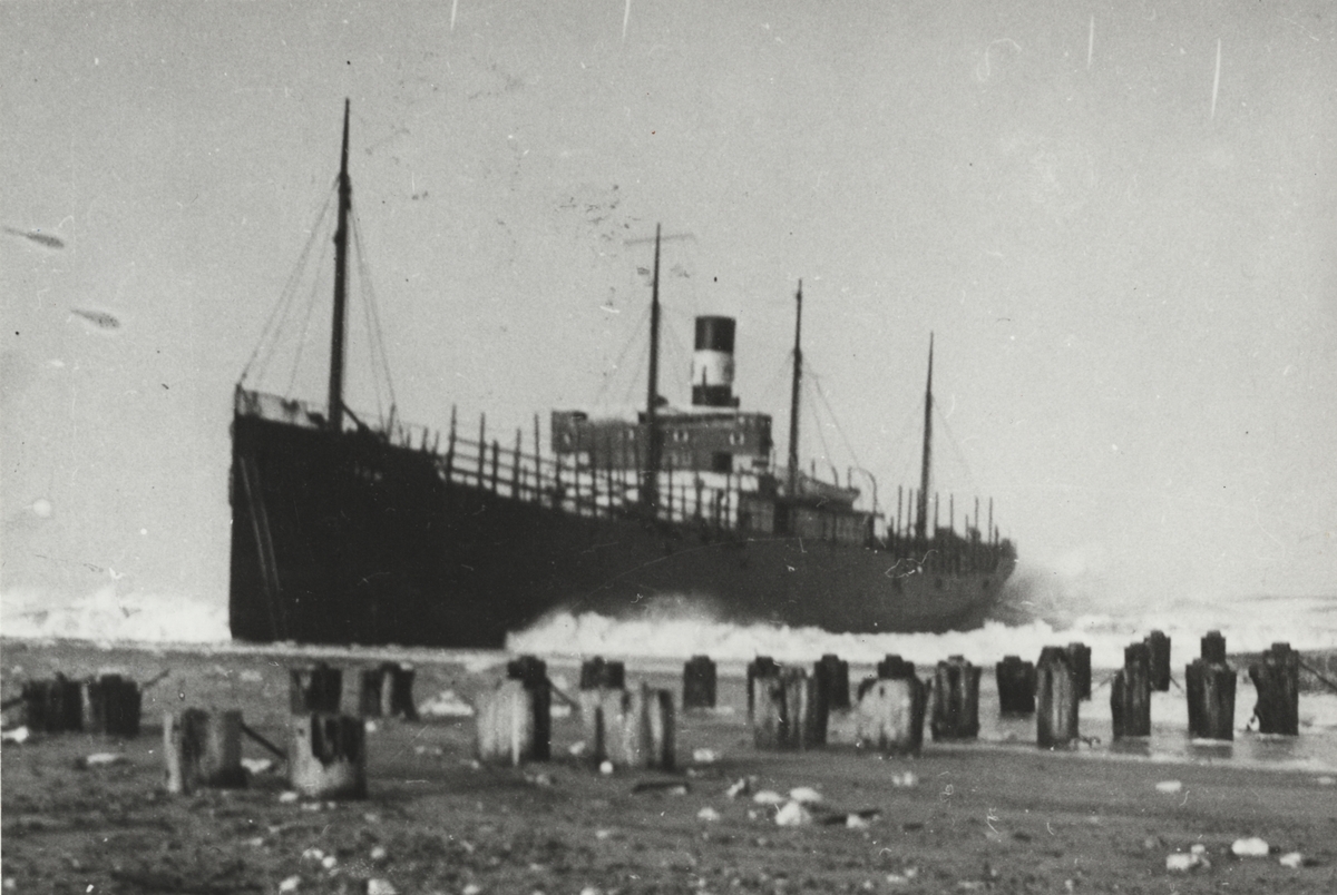 Lastångfartyget TOM av Stockholm, år 1934. Fartyget strandade under storm vid Hanstholm på Jyllands västkust. Manskapet blev räddat under dramatiska omständigheter. Bärgades i april 1934 av Switzer.