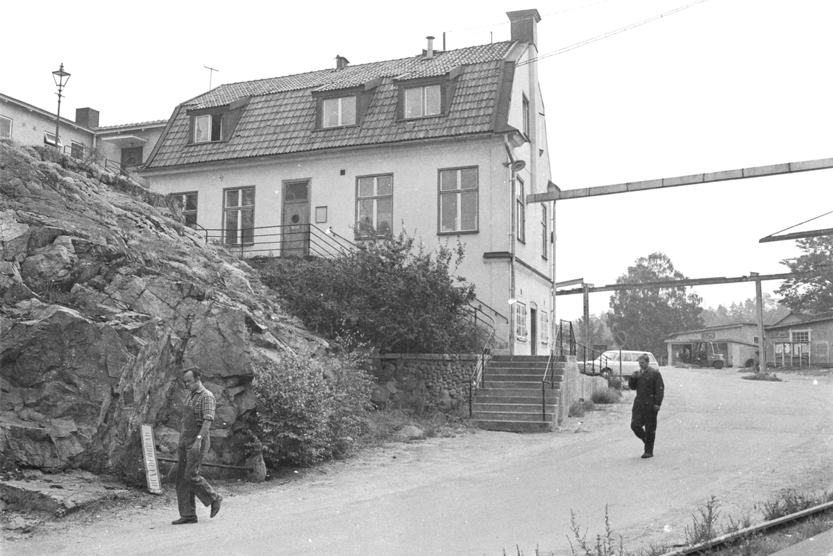 Ekensbergs varv 1970: varvskontoret, varvsarbetare. Varvskontoret tidigare Ekensbergs värdshus.