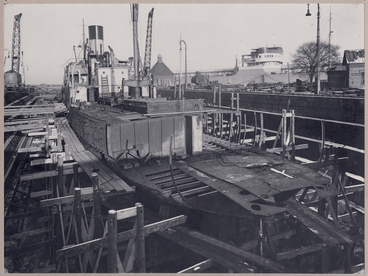 Stockholms Rederi AB Sveas lastångare GONDUL (reg nr 7451) under återuppbyggnad på Kockums i Malmö 5 januari 1941 efter att ha minsprängts i Flintrännan 1 oktober.