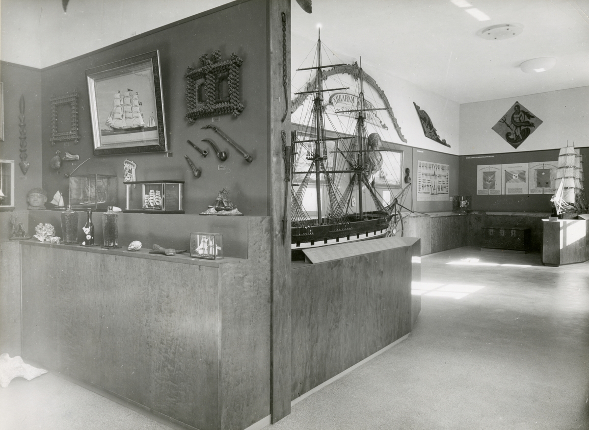 Utställning, Sjöfartsavdelningen. Sjömansarbeten. Till höger avdelningen för Sjömannaorganiskation.