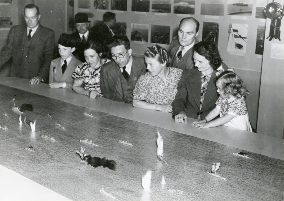 Utställningen "Svensk sjömannagärning i allvarstid". Besökare på utställningen tar del av ett modellarrangemang som visar ett störtbombanfall mot en fartygskonvoj.