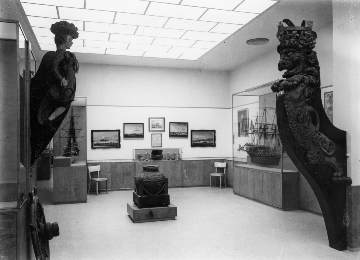 Utställning i Ostindiesalen i Sjöfartsavdelningen. Galjonsfigurer, fartygsmodeller i montrar m.m.