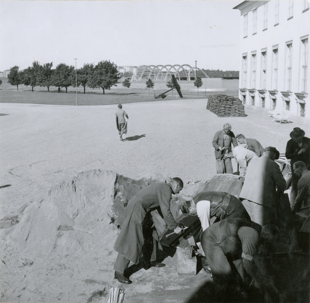 Luftskyddsåtgärder utanför Sjöhistoriska museet. Säckar fylls med sand.