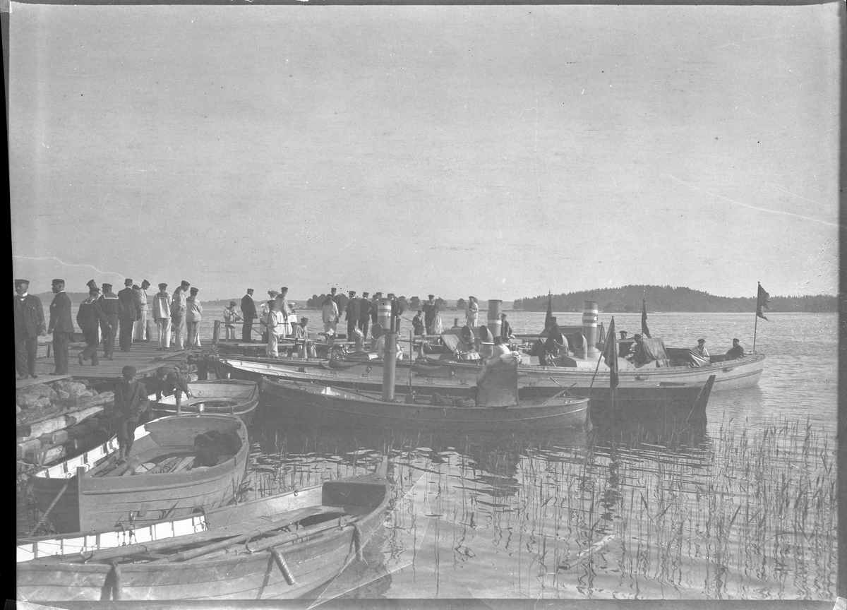 Berga Örlogsskola: Idrottstävling i Lövlund. Båtar och ångbarkasser vid bryggan.