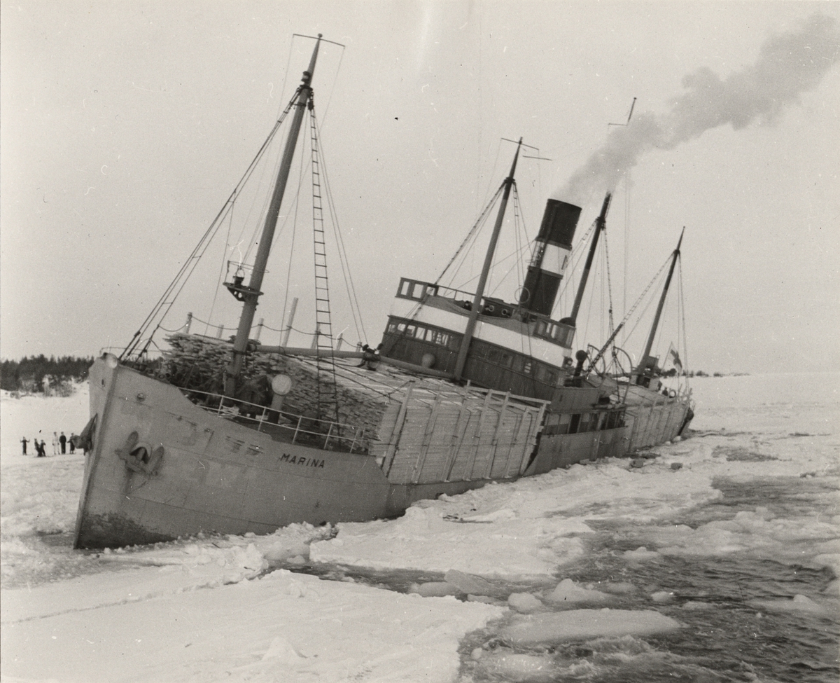 Titel: S/S MARINA av Helsingfors, som fick kraftig BB slagsida, då ISBRYTAREN II skar loss henne vid Simpnäs den 8 mars 1942.