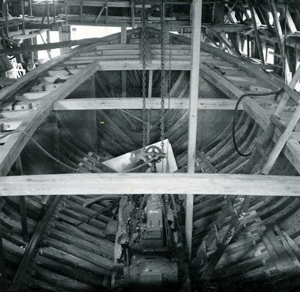 Lunds skeppsvarv.Lotsbåt under byggnad. Skrovinteriör med spant- och däcksbalkar samt förstärkningsskott av aluminiumplåt.