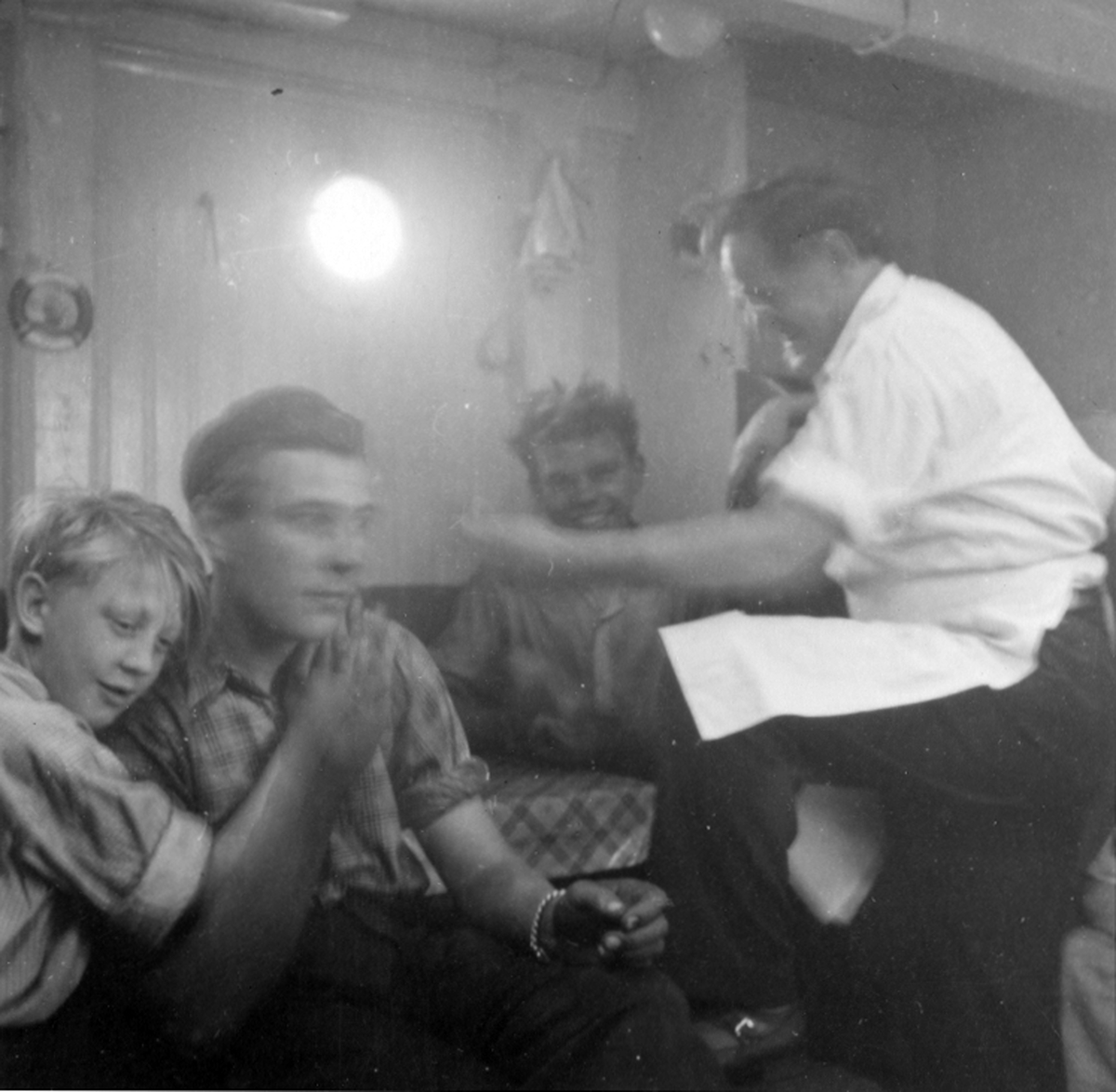 Motorskonaren Lisa av Bergkvara. Interiör från skansen med kock och 3 matroser samt 2 pojkar från land på besök.