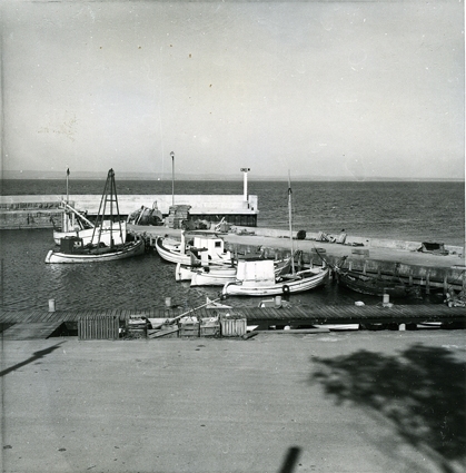 Sedd från SV. I bakgrunden pirhuvudet, th sydöstra hamnarmen med fiskebåtar, i förgrunden småbåtsbryggan. Foto N Nilsson juni 1962.