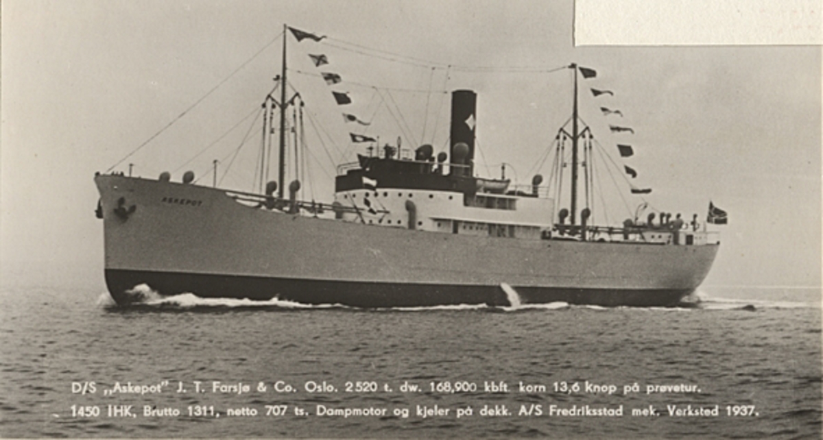 D/S "Askepot" J.T. & Co. Oslo. 2520 t. dw. 168900 kbft. korn 13,6 knop på prøvetur. 1450 IHK, Brutto 1311, netto 707 ts. Dampmotor og kjeler på dekk. A/S Fredriksstad mek. Verksted 1937.