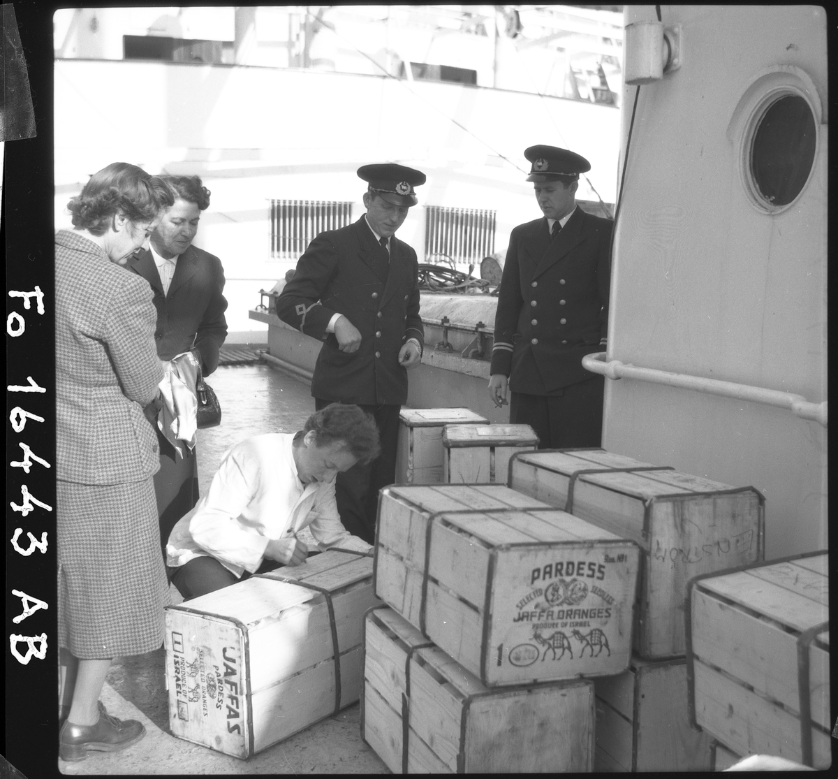 2e och 3e styrmännen i Golden Ocean kontrollerar passagerares apelsinköp i Haifas hamn
