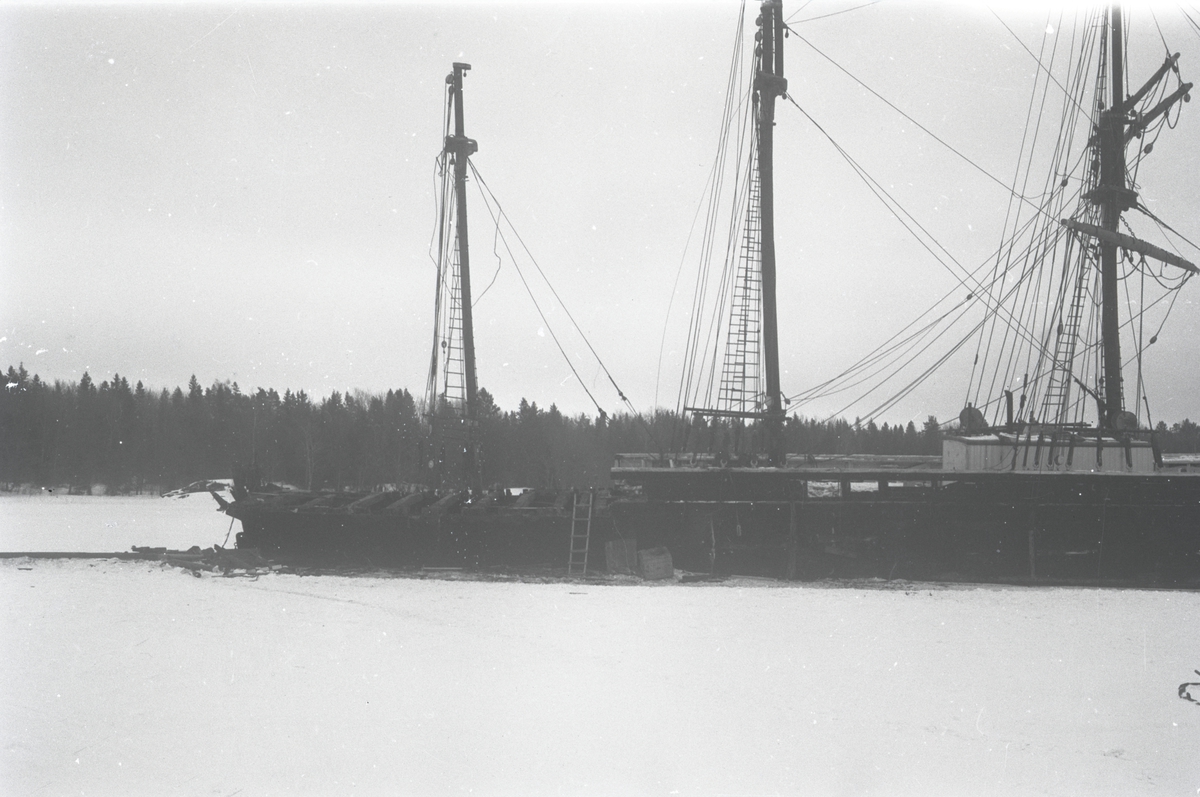 [från fotobeskrivningen:] "Upphuggning av 3-mastade skonertskeppet ZIBA AV KALMAR [sic] på Vätö, Uppland mars 1940."
