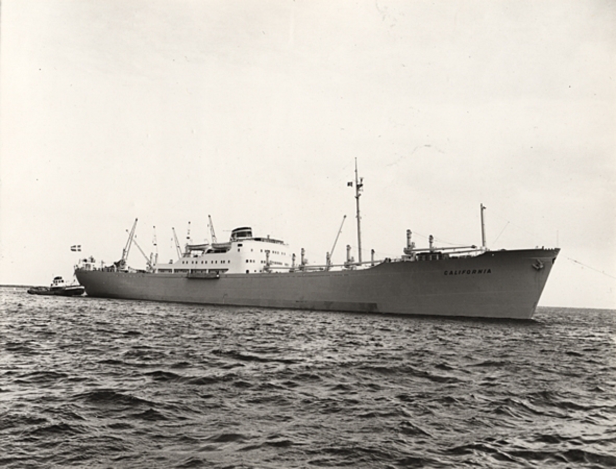 Foto i svartvitt visande lastmotorfartyget "CALIFORNIA" taget i Köpenhamn den 10.6.1959.