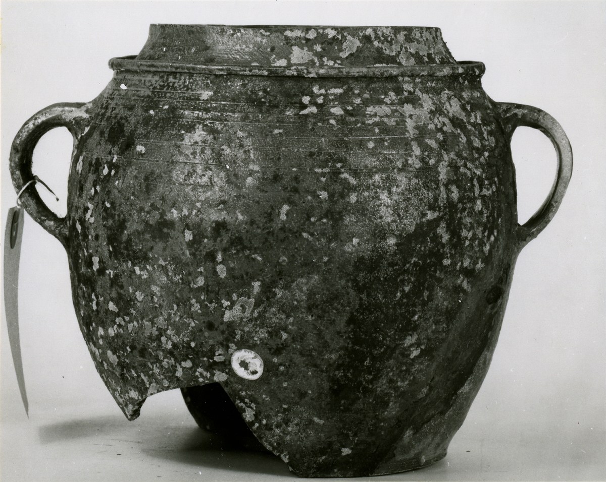 Kruka av stengods, med två öron, glaserad, utsidan något räfflad, ett stycke avslaget. Sjöfynd från Djurhamn.