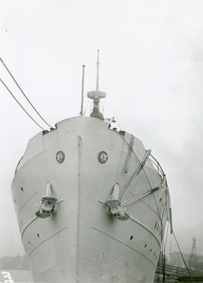 Passagerarångfartyget BRYNHILD av Stockholm sedd förifrån vid Skeppsbron i Stockholm, 1954.