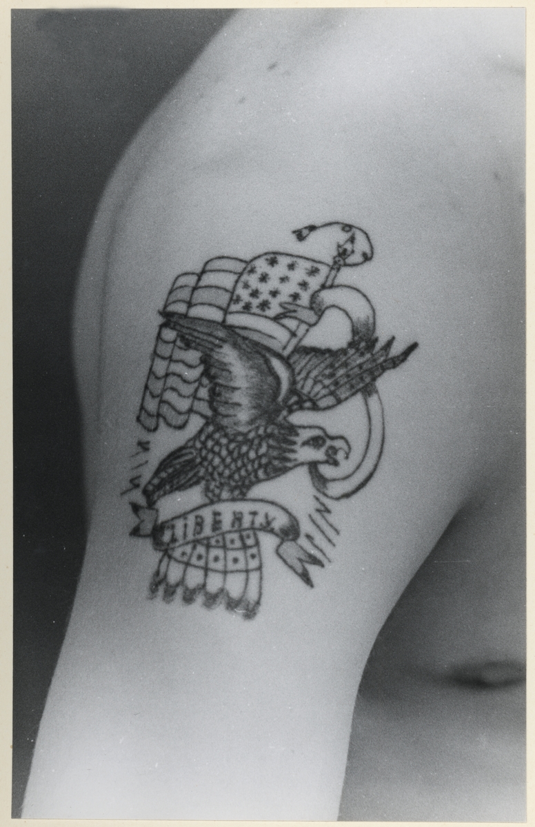 Tatuering i rött och blått på höger överarm utförd i Rotterdam 1940.