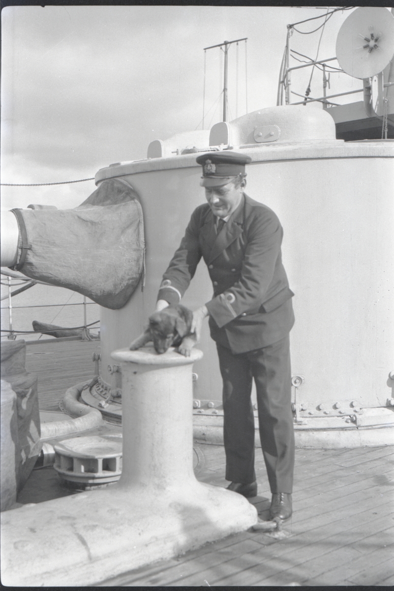 Reservofficer med skeppshund ombord på örlogsfartyg. Enligt anteckning av Berger togs bilden i samband med besök av 2:a flygkåren 1929. Jfr Fo229143A.