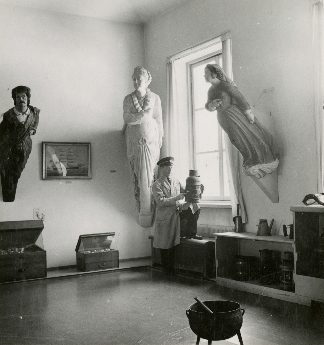 Utställning i Sjöfartsavdelningen, mastrummet. En man håller i en större lanterna i utställningarna.