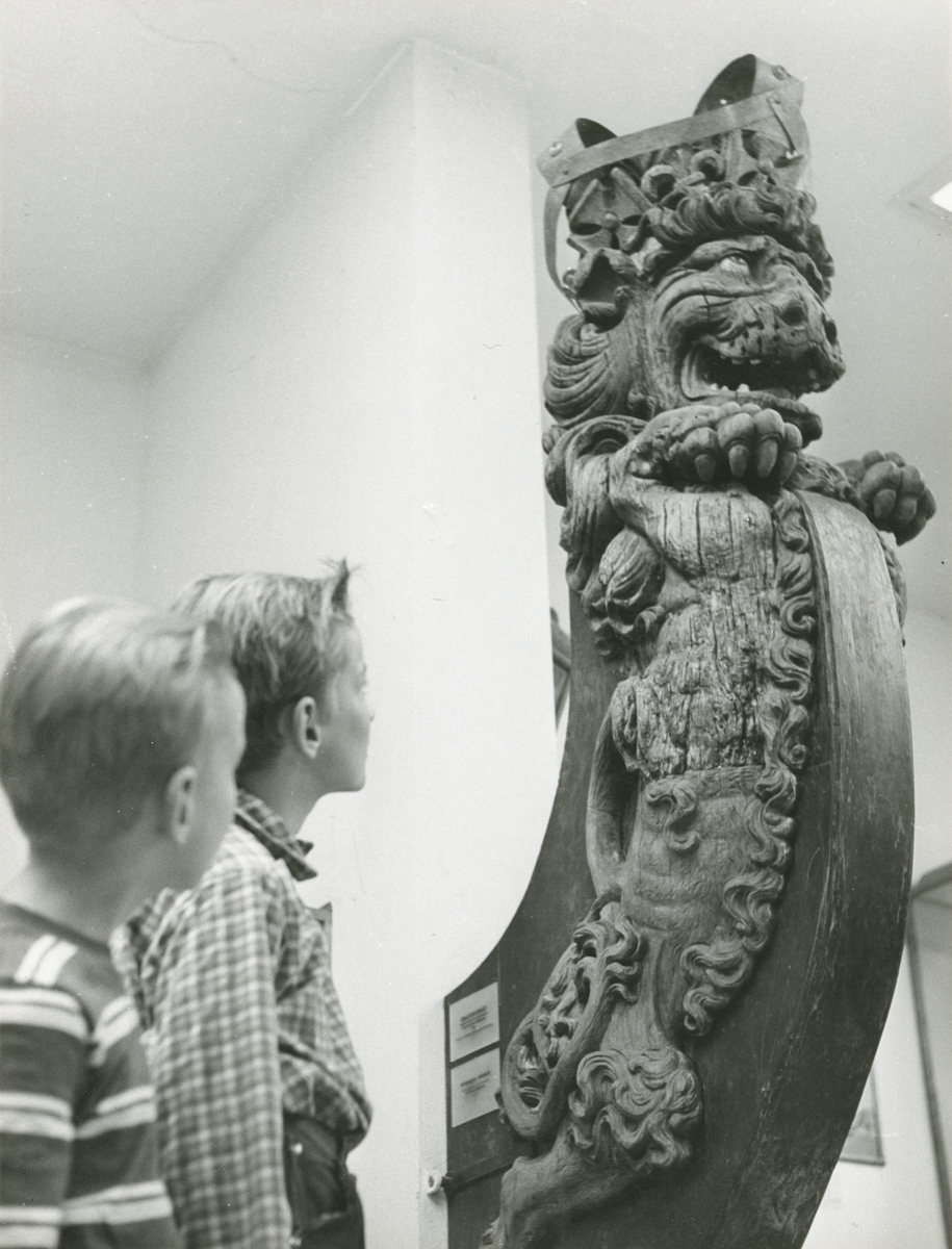 Två pojkar i utställningarna i Sjöfartsavdelningen, rum 3 och 4. "En galjon beundras".