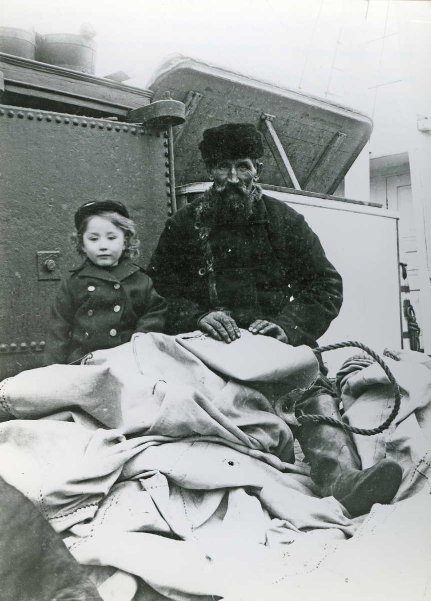 [från fotobeskrivningen:] [---] "Ombord på Wanja, Cuxhaven 1906. Kapten Holmgrens äldste son Halvar och segelsömmare." [---]