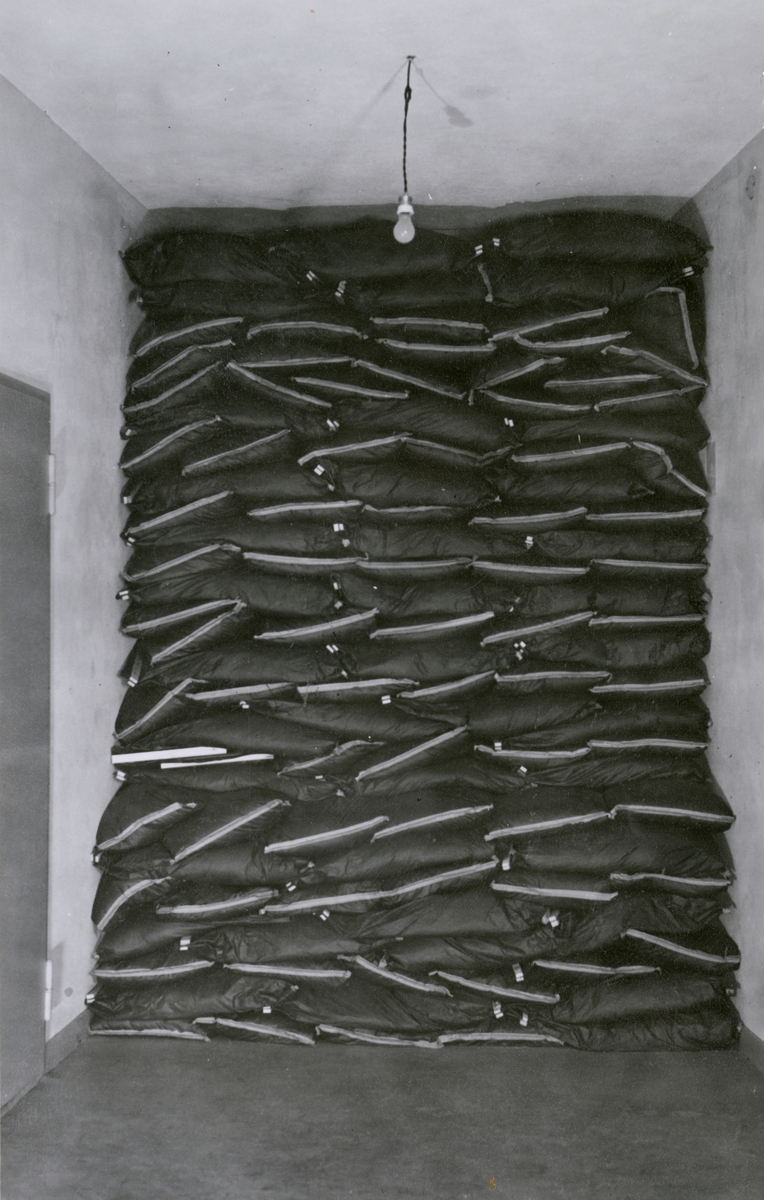 Luftskyddsåtgärder i runda rummet, souterrainvåningen. Sandsäckar som splitterskydd framför en igensatt dörr.