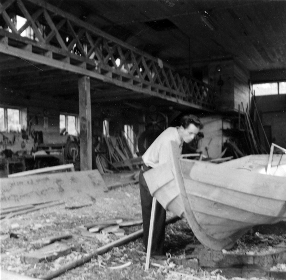 Hugo Olssons varv. Båtbyggare Inge Olsson lägger in intimren i en blekingseka.