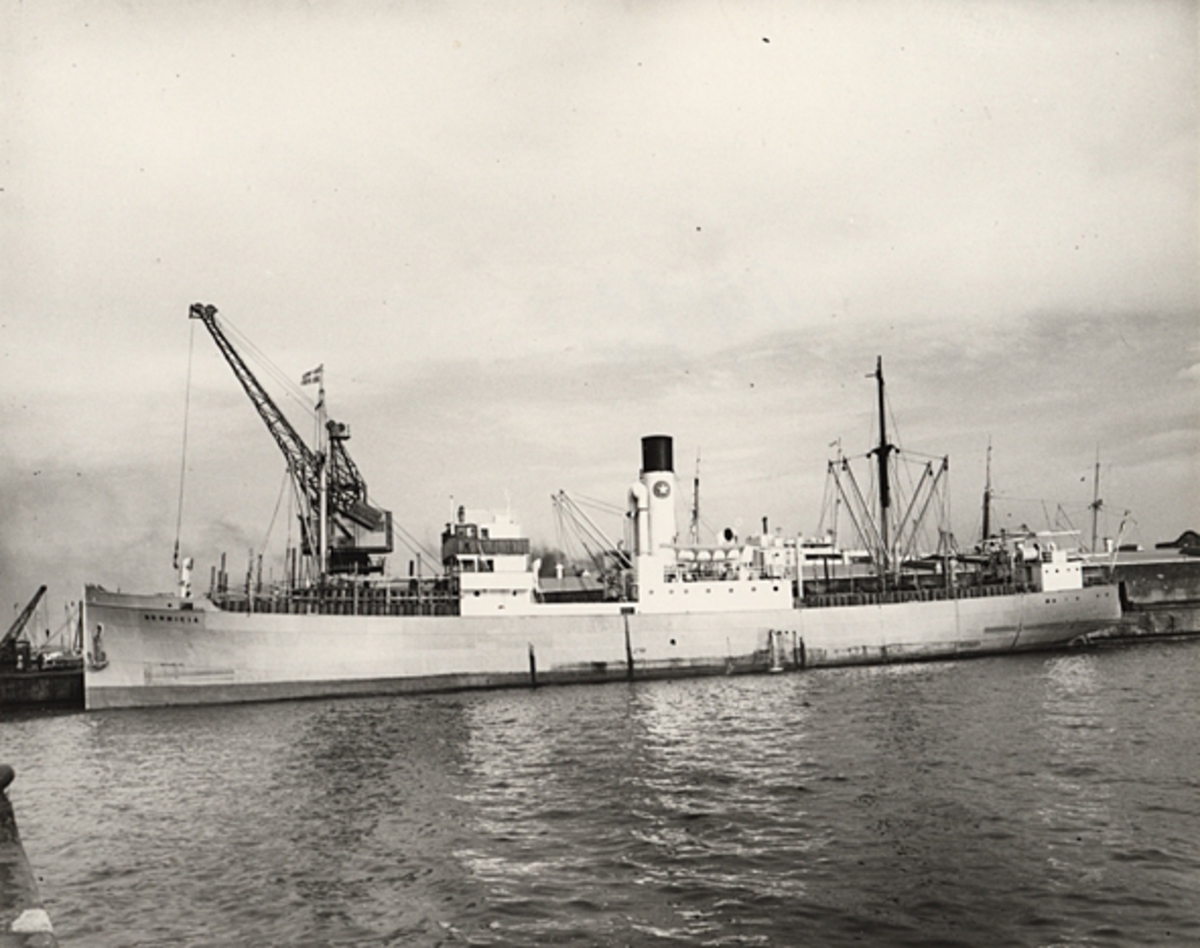 Foto i svartvitt visande lastångfartyget "BERNICIA" i Köpenhamn under september månad 1953.