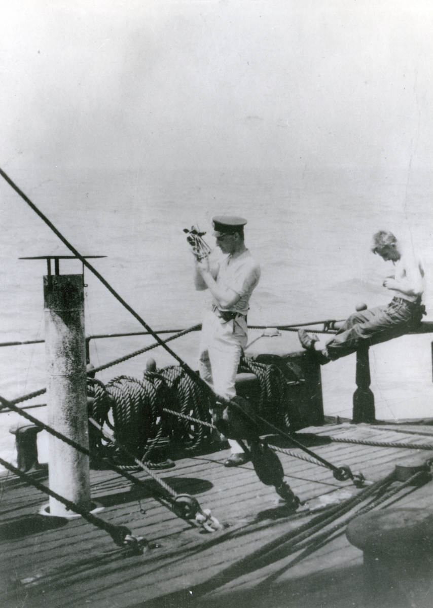 [från fotobeskrivningen:] [---] "Befälhavaren på 4-mast barken ABRAHAM RYDBERG, Kapten Sune Tamm tar solhöjden under resa från Dublin till Göteborg i Juli 1930. Barken kommer från San Fransisco [sic] där den inköps av Redab. Sunnan i Sthlm för Rydbergsstiftelsens räkning."