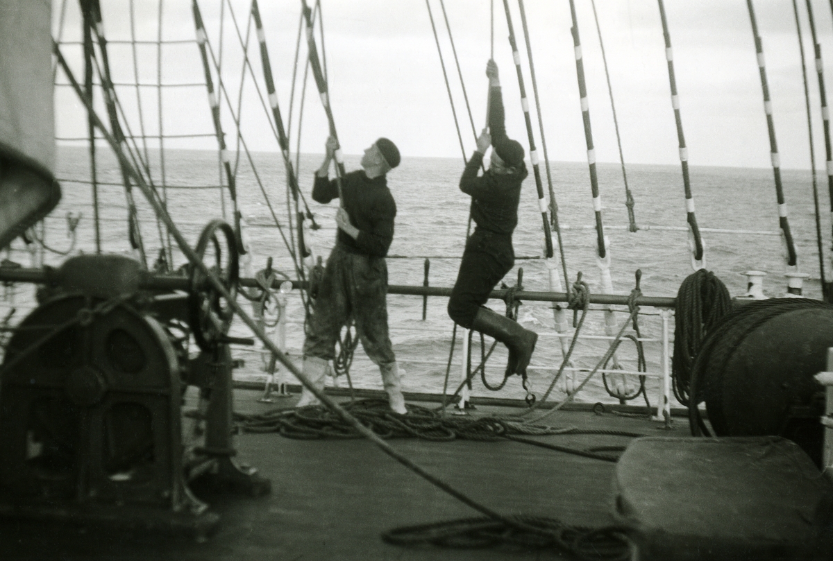 Genomvindsvändning med barken Abraham Rydberg [3], bram- och röjelbassar till förtoppen halas, th Olof Götman, sedermera kapten i Kungl. Flottan