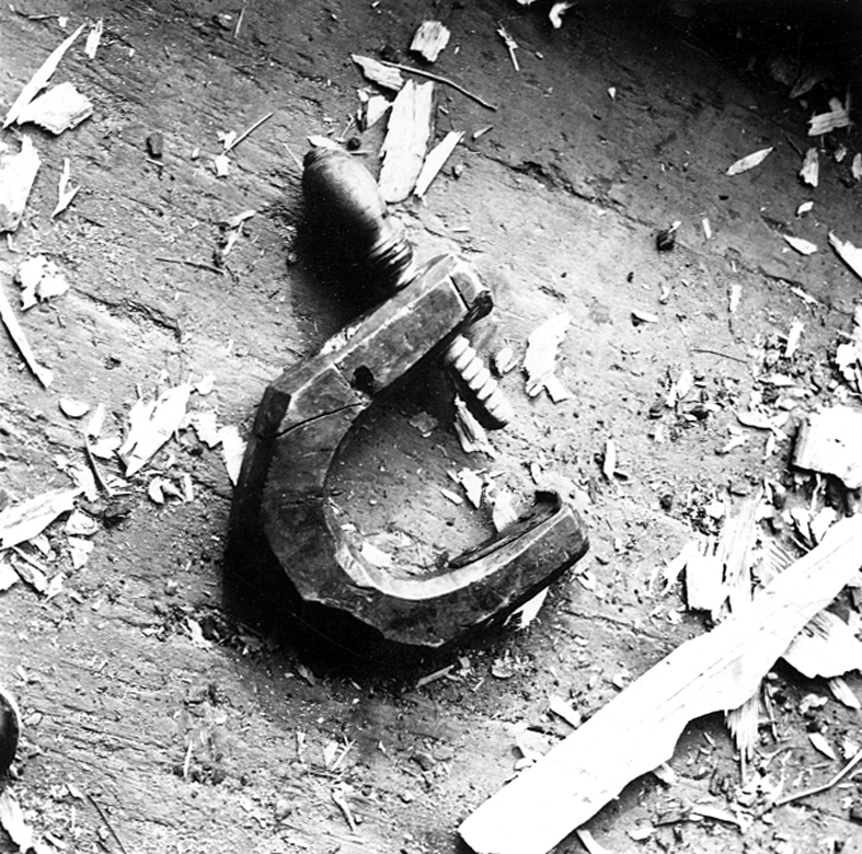 Neg nr 103. Den skruvtving med metallskodd skänkel som används vid bordspetsarnas fastsättning vid stävarna. Foto 8.8 (1962).