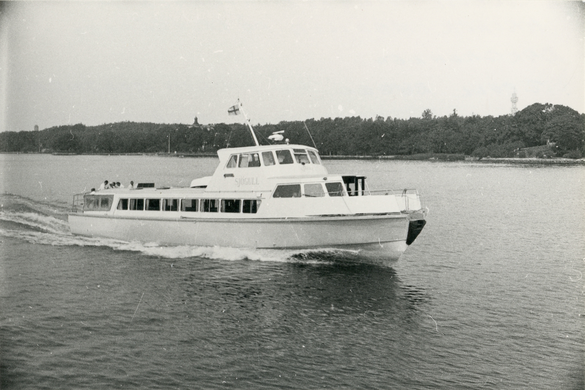 M/S Sjögull utanför kvarnen Tre Kronor, Manilla på Djurgården i bakgrunden.