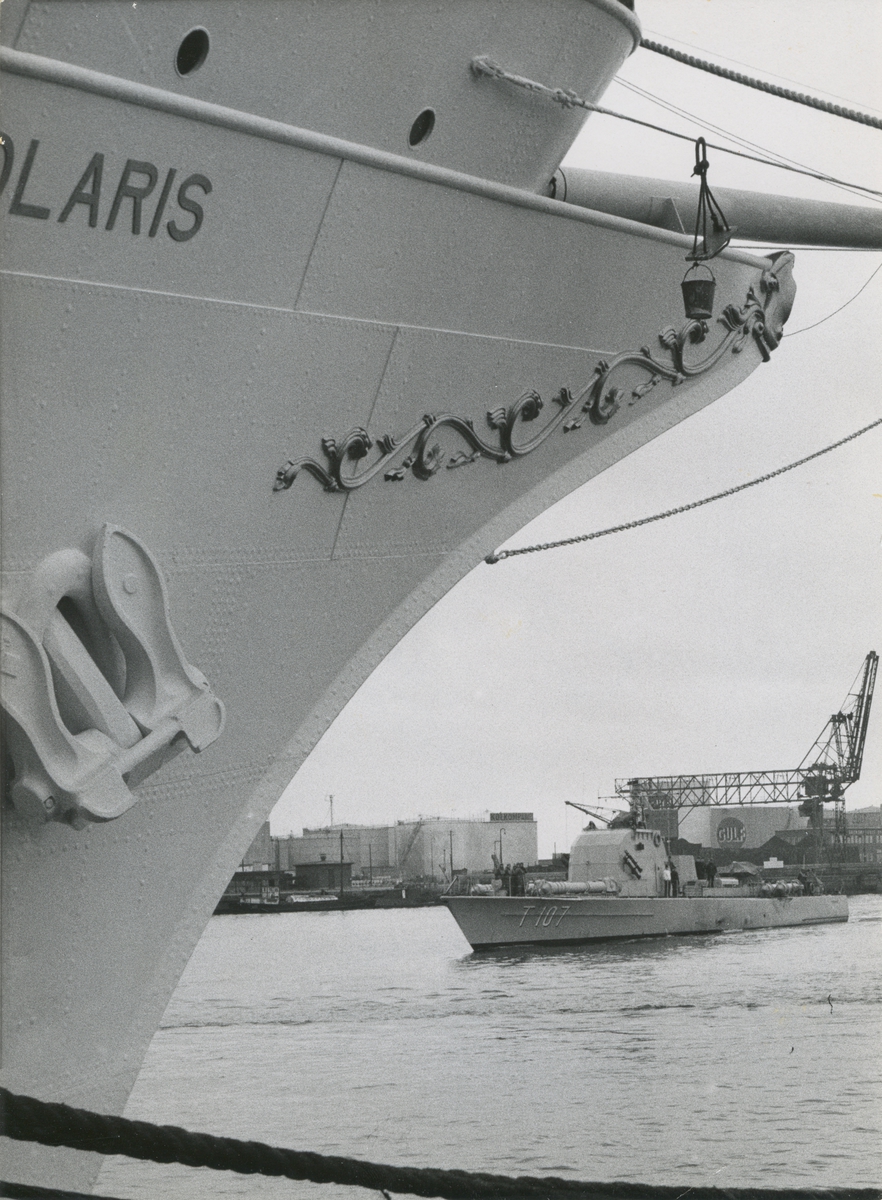 Passagerarmotorfartyget Stella Polaris i Malmö hamn den 16:e november 1956. I bakgrunden den svenska torpedbåten