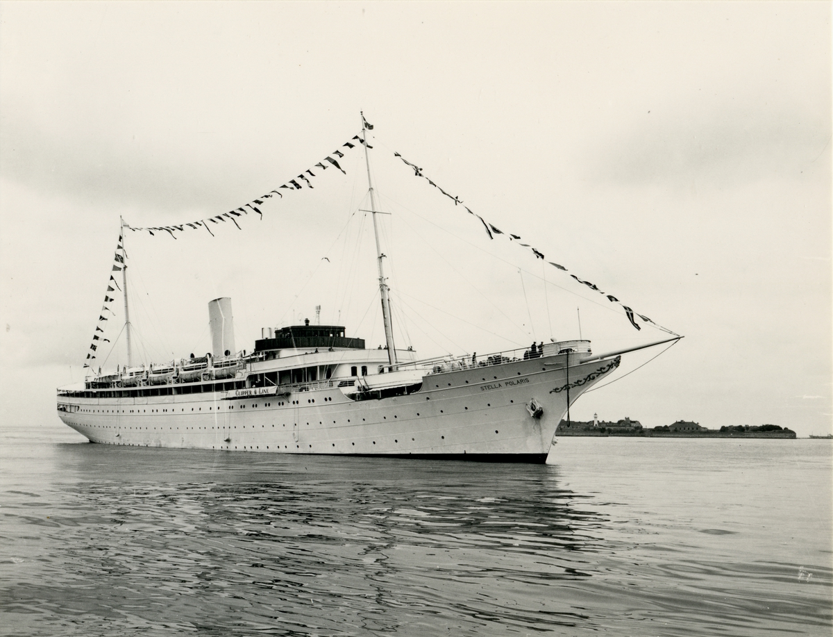 Foto i svartvitt visande passagerarmotorfartyget Stella Polaris i Köpenhamn den 27.8.1958