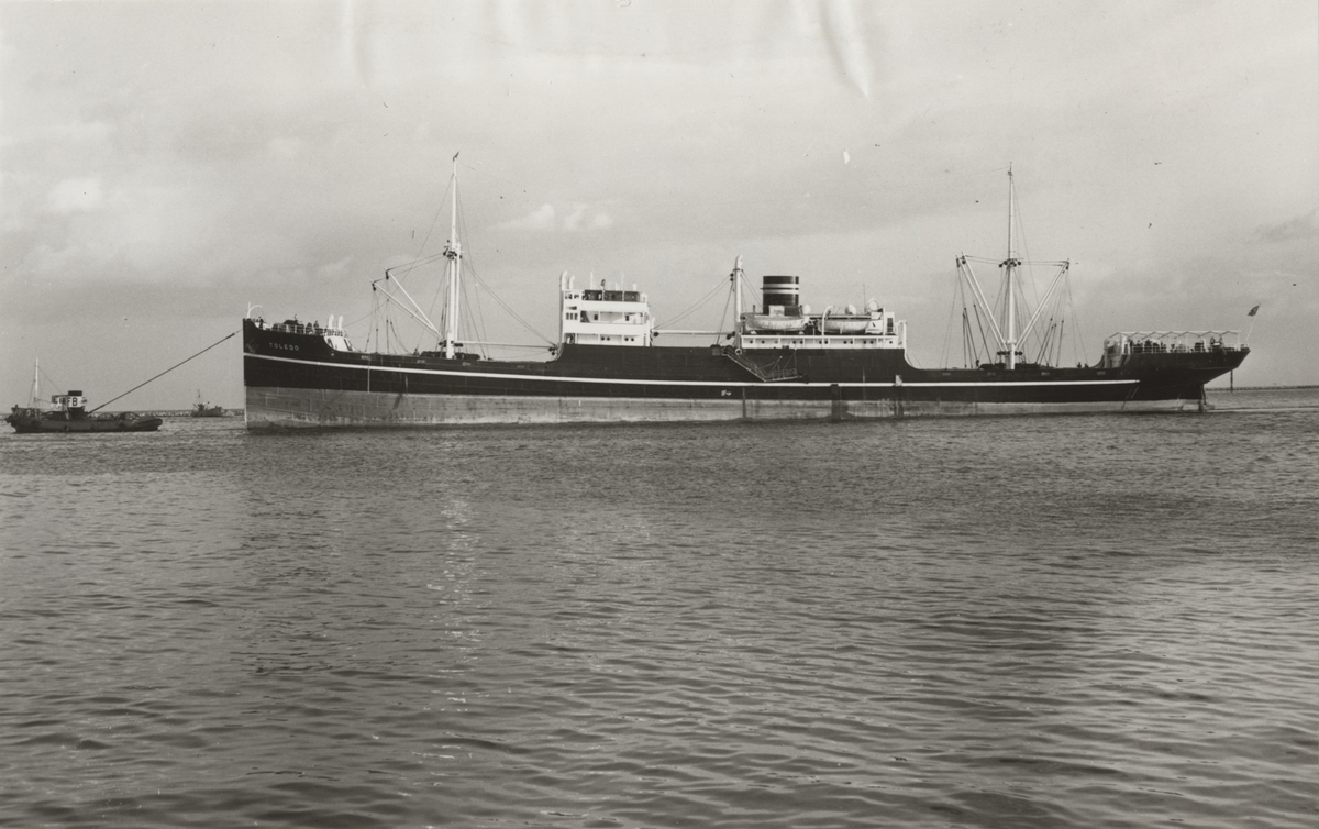 Foto i svartvitt visande lastmotorfartyget "TOLEDO" av Tönsberg under bogsering i Köpenhamn.