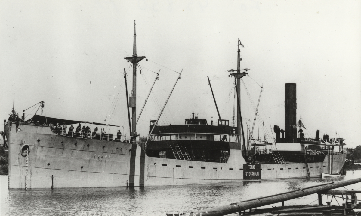 Foto visande lastångfartyget "TORNE" av Stockholm. Foto från 1915. Befälhavare Ernst Baumgardt.
