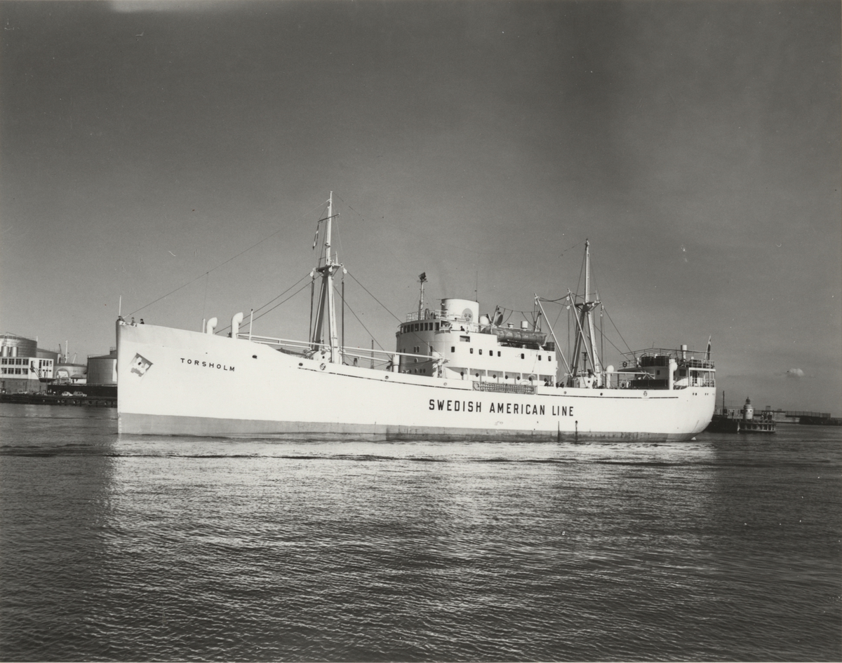 Foto i svartvitt visande lastmotorfartyget "TORSHOLM" i Köpenhamn under 1950-talet.