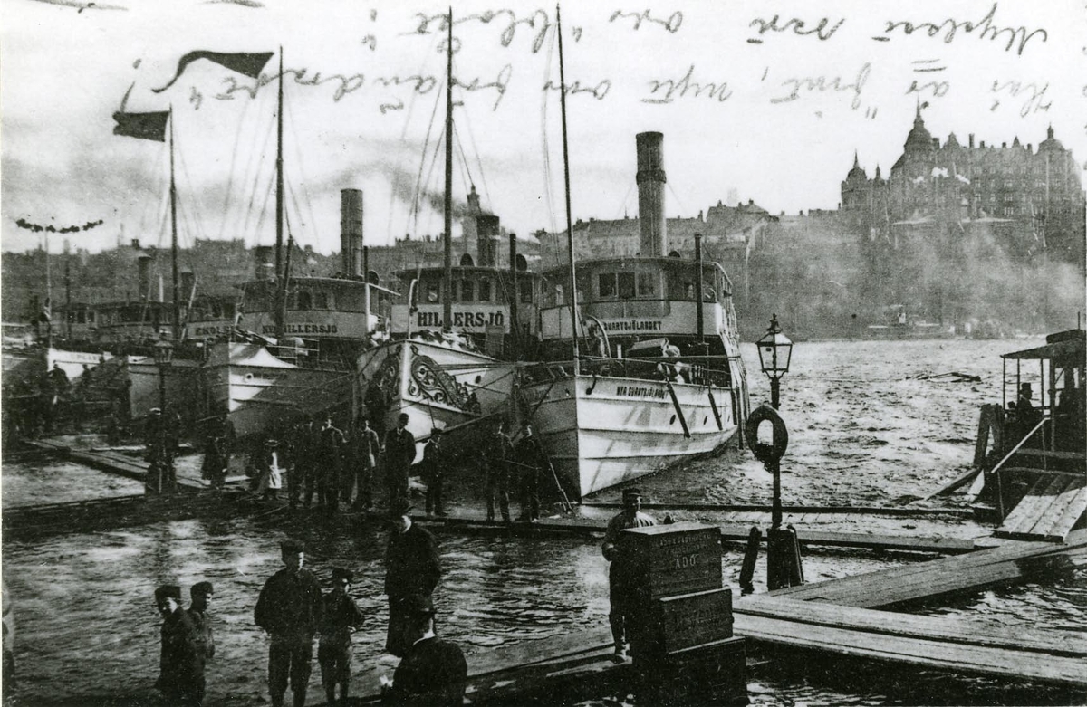 Postkort, föreställande Mälartorget i Stockholm vid vårfloden 1904. Vid kaj ligger mälarbåtar, bla. Nya Svartsjölandet, Hillersjö, Nya Hillersjö och Ekolsund.