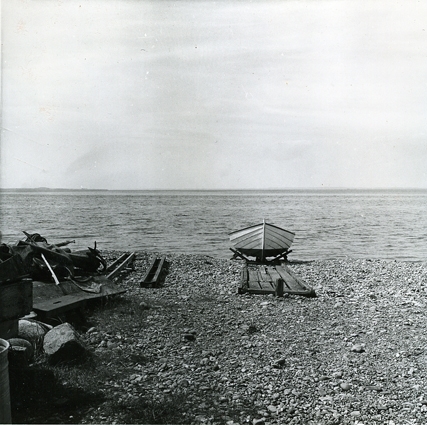 Skånesnipa uppdragen på ett markfast plan av grova plankor. OBS tv de två trälämmarna med rörliga rullar vid uppdragningen. Stranden mot Öresund. Skåne, Malmöhus län, Råå.