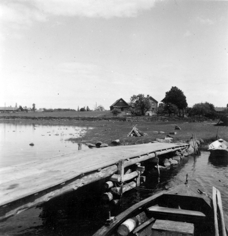 Småland, Kalmar län, Stranda härad, Ålems socken, Lövön. Elias och Oskar Gustafssons brygga med EG:s gård i bakgrunden.