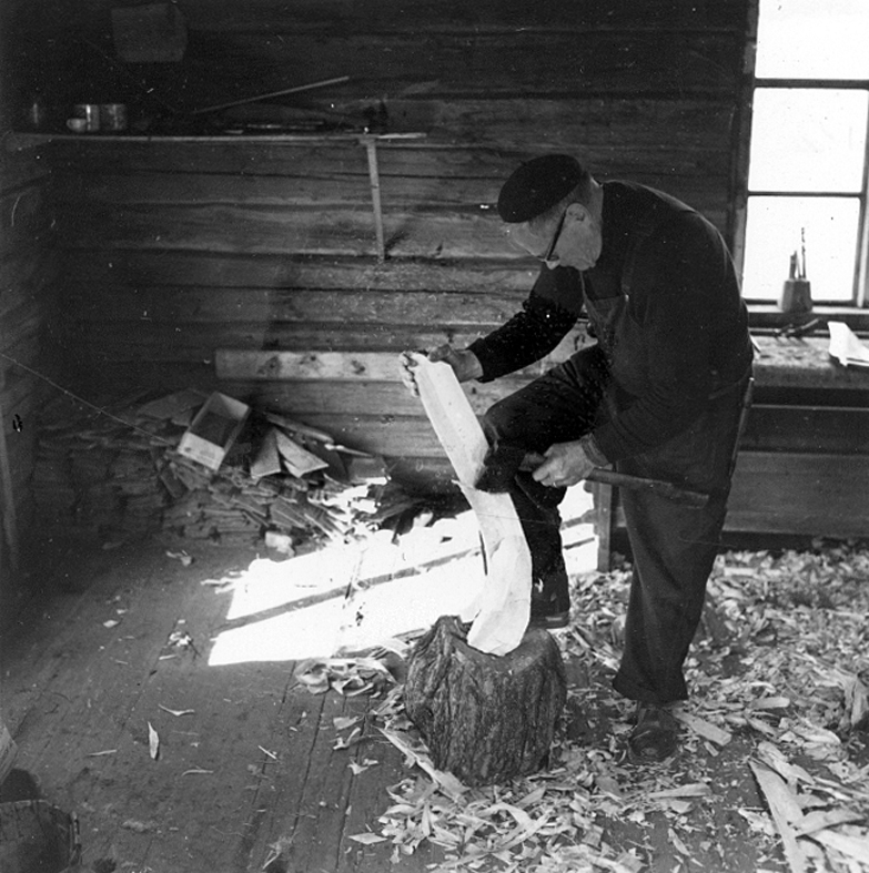Neg nr 41. Fintäljning med yxa av "framskarven". Ämnet hålles mot huggkubbe. Foto 6.8 (1962).