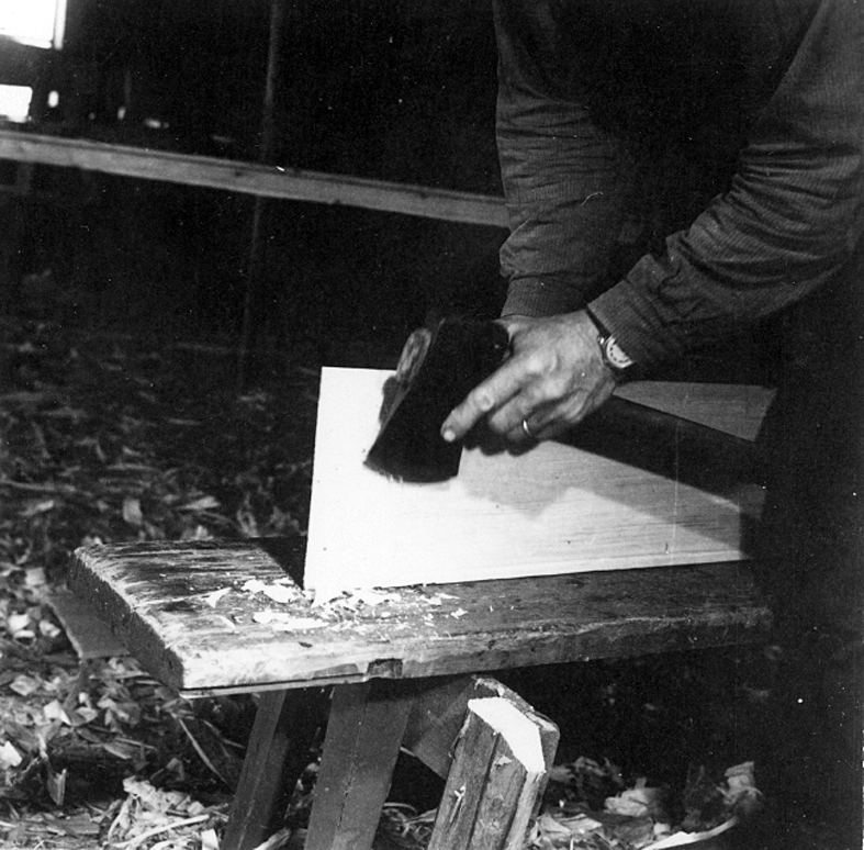 Neg nr 114. Bordskarvens snedhuggas med yxa med. Foto 8.8 (1962).