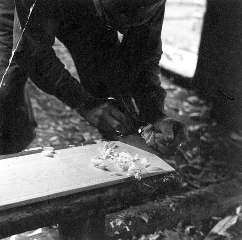 Neg nr 115. Bordskarvens snedhuggas med yxa med. Skarven putsas med hyvel. Foto 8.8 (1962).