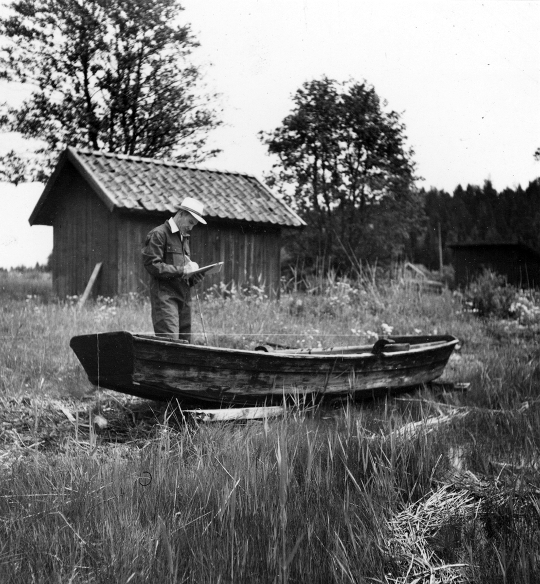 Uppland, Stockholms län, Frötuna skeppslag, Länna socken, Mora by. Konservator Åkerlund mäter en flatbottnad eka, juni 1950