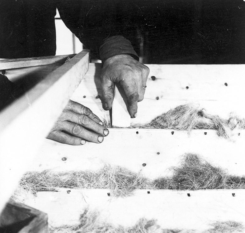 Neg nr 189. Renhåret stoppas med en "spade" in i fogarna på framhusspantets plats. Foto 13.8 1962.