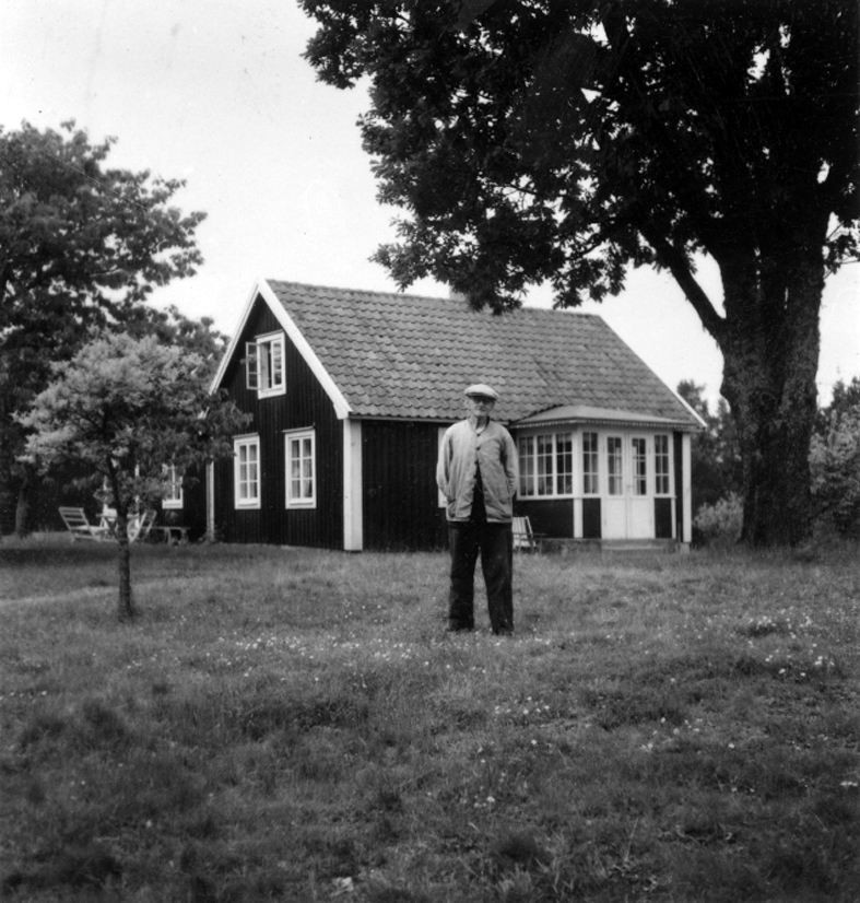 Småland, Kalmar län, Stranda härad, Mönsterås socken, Vedholmen. Förre skepparen Nyberg i sin trädgård.