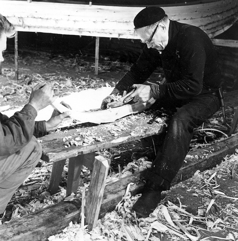 Neg nr 196. "Hyvling av framhuvudspantets insida med "krokhyvel". Foto 13.8 1962.