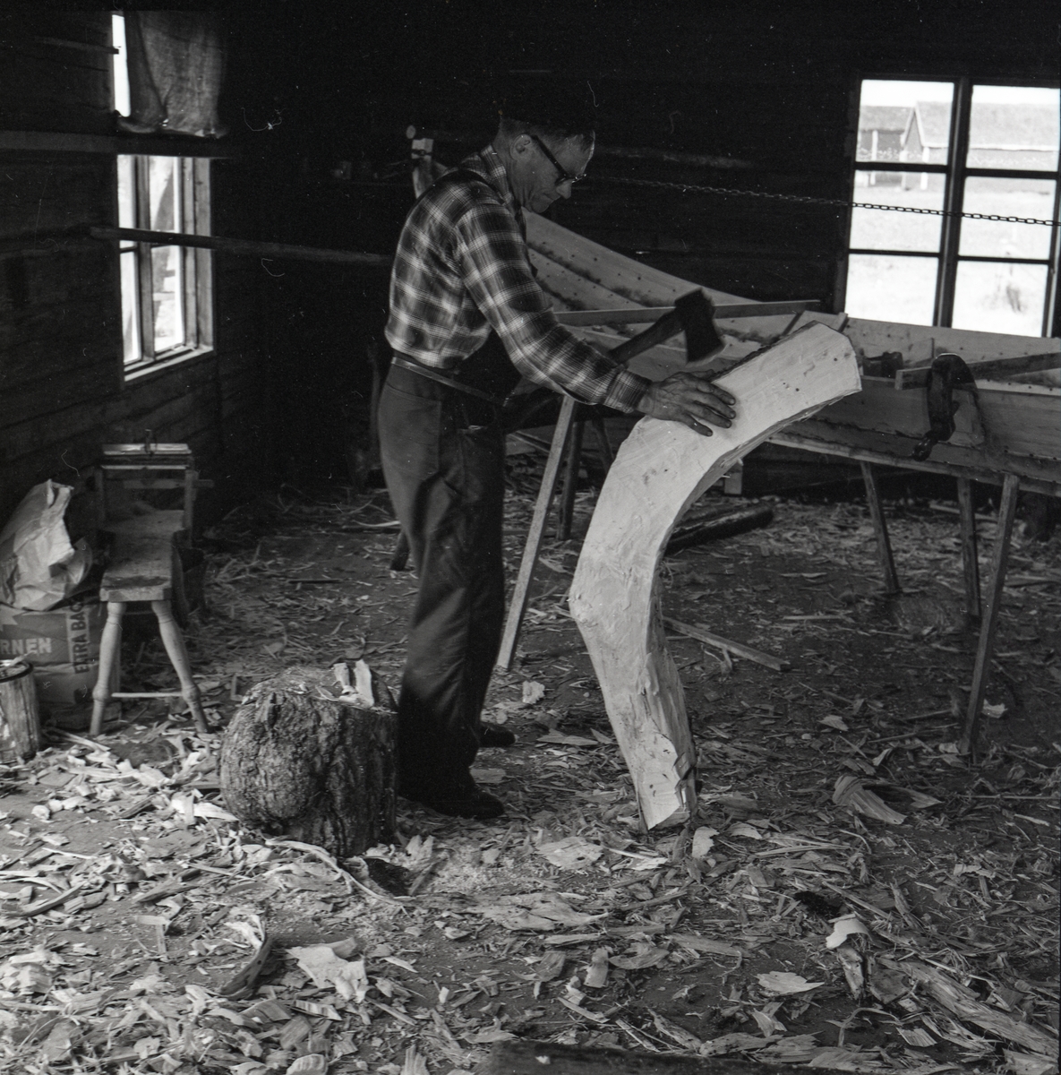 Neg nr 211. Täljning med yxa av bakhusspantet. Foto 14.8 1962.