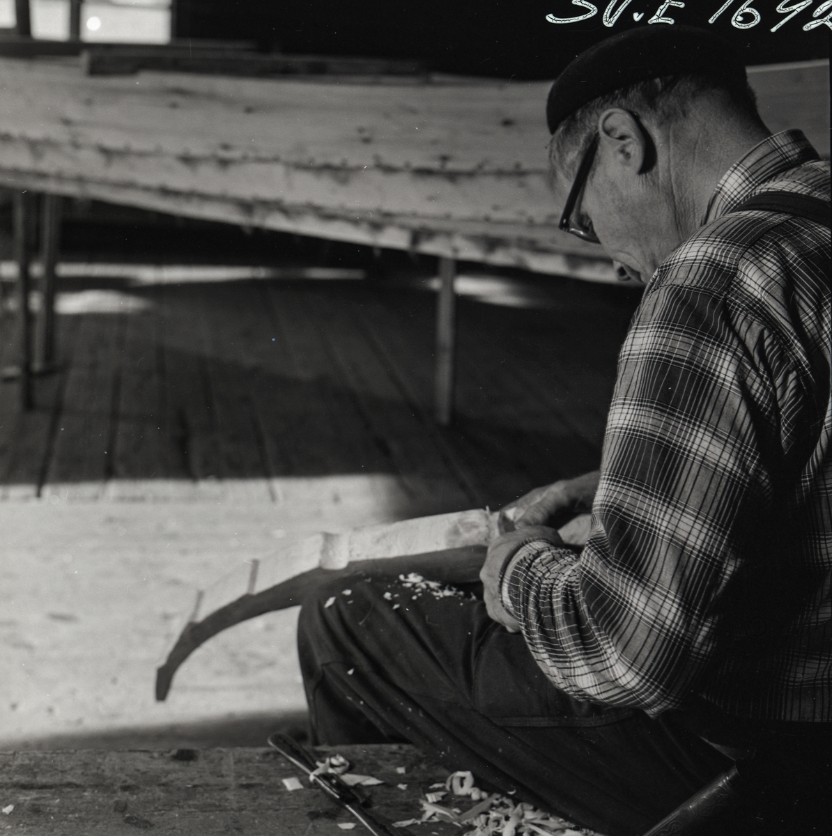 Neg nr 222, Spantets undersida täljes till med kniv. Foto 14.8 1962.
